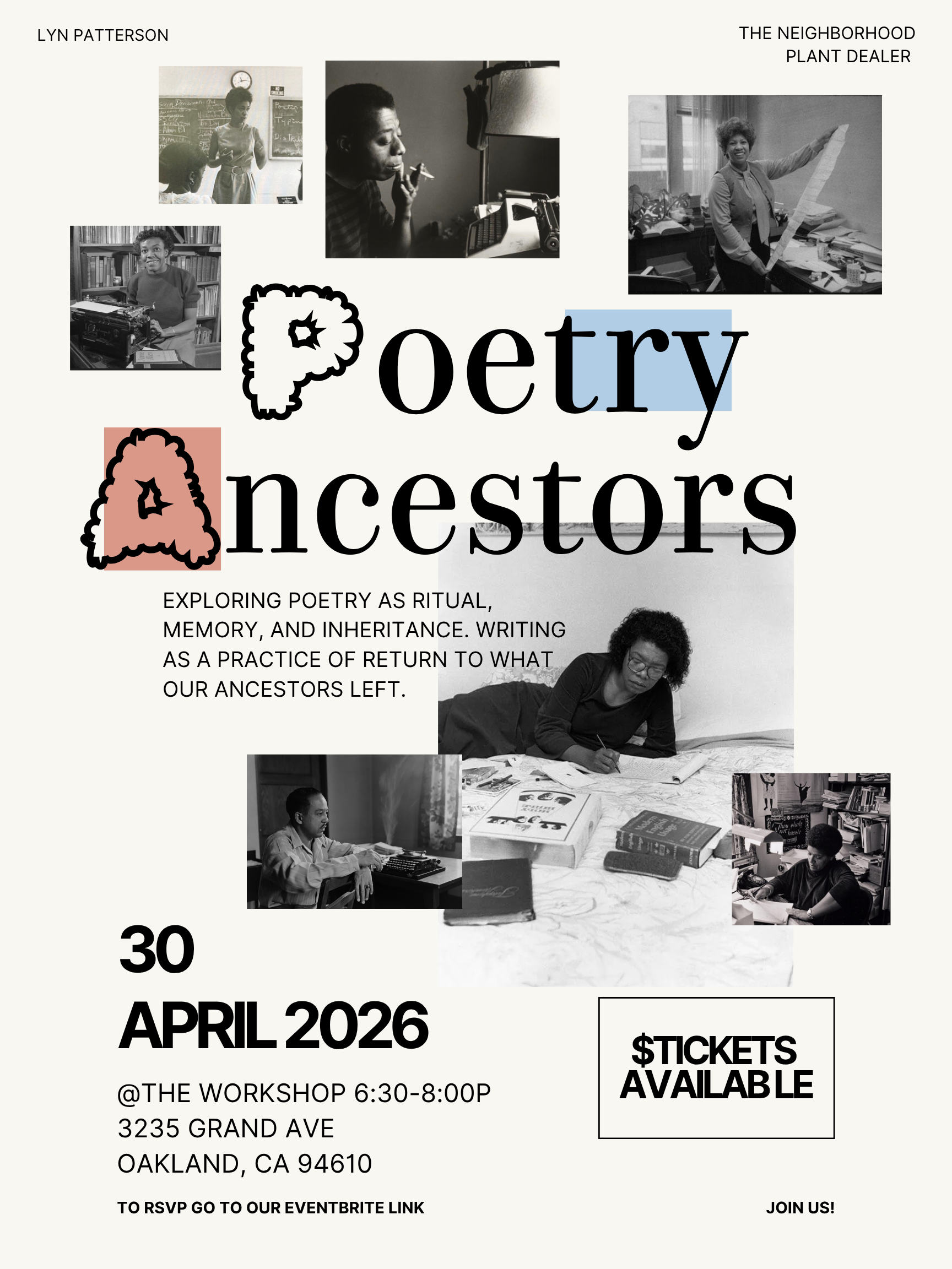 The Neighborhood Plant Dealer will be on site with plants and herbs for building poetry altars, offering a tactile way to ground your writing in ritual and intention.